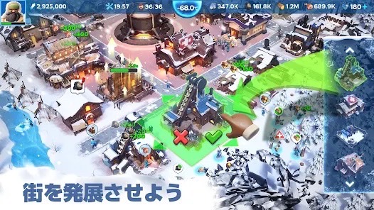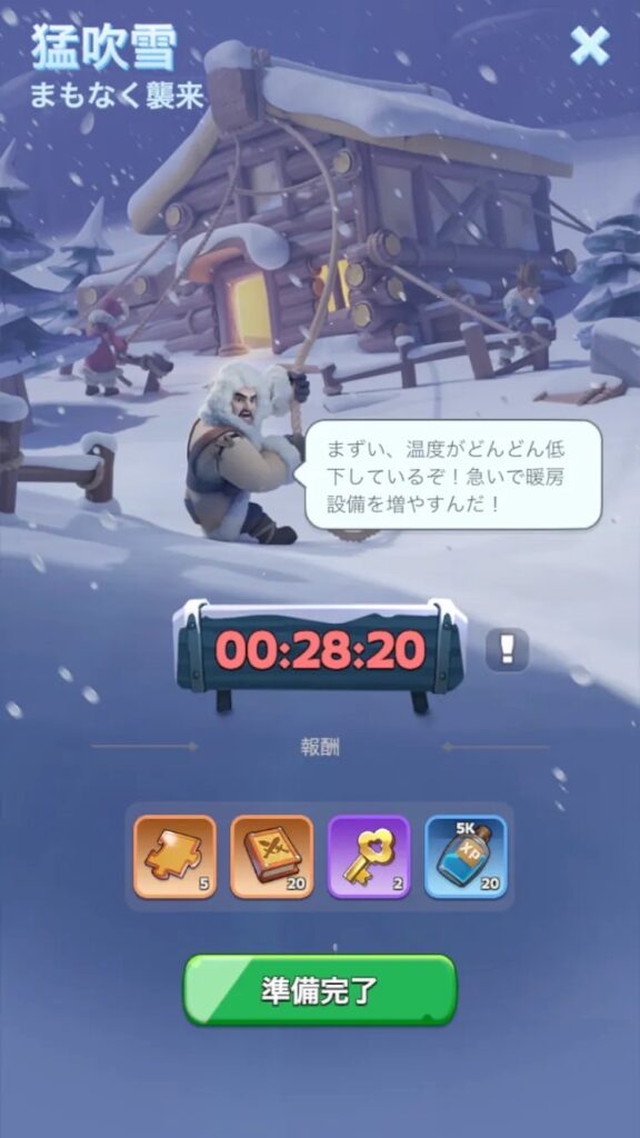 自分の極寒箱庭を育てていくシミュレーションゲームが主で、建物を建てるだけでなく、村を広げ、豊かにして、村人を生き残らせる必要があります!村の中央には巨大な暖炉があり、温度を調節して村人を寒くさせないようにできます!建物はレベルアップするたびに時間がかかってくるので、スキマ時間にちょくちょくレベルアップさせましょう!