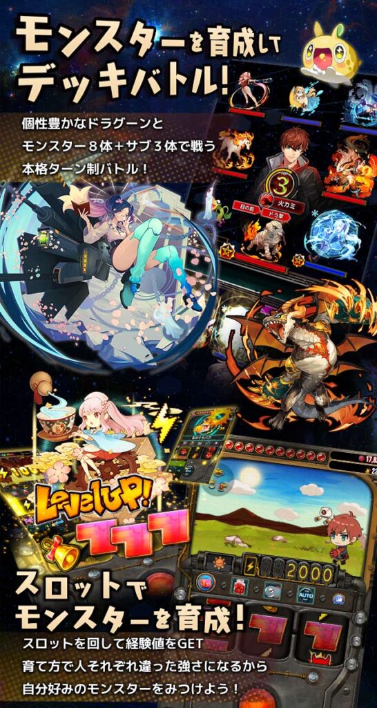 このゲームはモンスターとそれを率いる「ドラグーン」とともに、未知の惑星を探索し、宇宙の頂点を目指す領土争奪バトルゲームです。