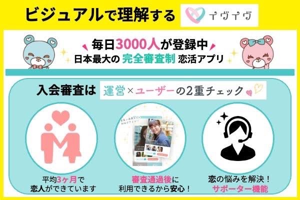 登録は完全審査制なので、利用開始には入会審査への合格が必須です。入会審査を通過するコツは、イヴイヴの公式サイトに書かれていますのでそちらをご覧下さい!