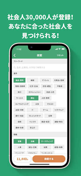 ①大学関係なく42,000人の社会人に”OB・OG”訪問をしてもらうことができる