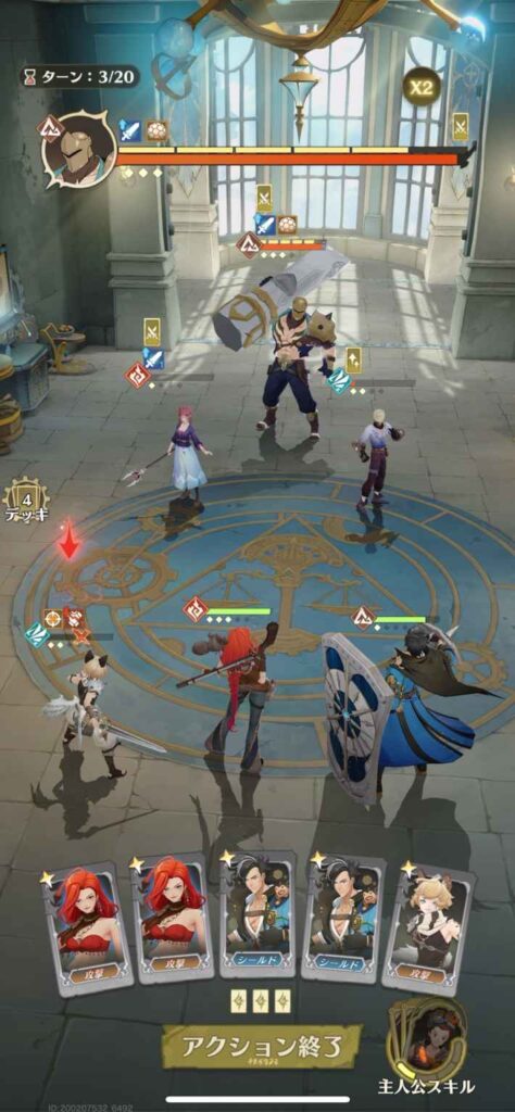 ゲームはパーティ編成3名で臨むターン制のカードバトルRPG。 毎ターン行動可能回数を消費して、手札のスキルカードを繰り出しながらバトルを展開していくことになる。